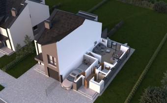 Parter: wiatrołap, hol, łazienka, pokój dzienny z aneksem kuchennym, kotłownia oraz garaż.