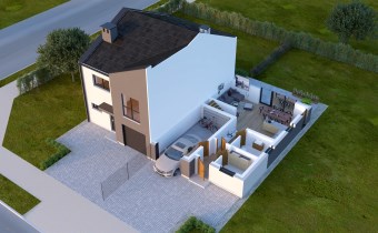 Parter: wiatrołap, hol, łazienka, pokój dzienny z aneksem kuchennym, kotłownia oraz garaż.