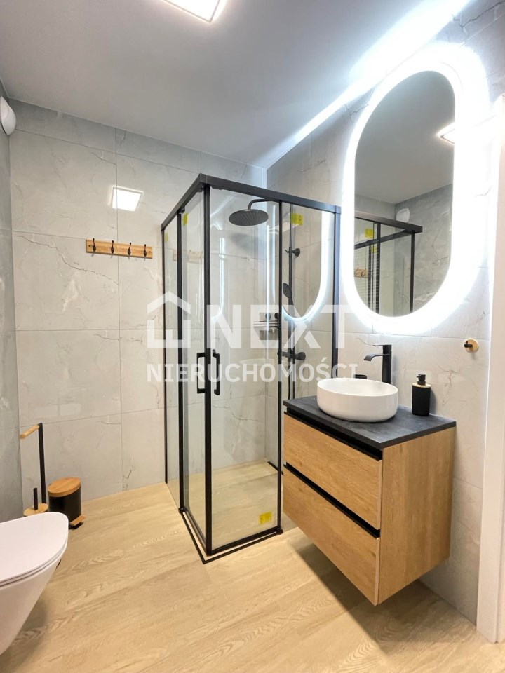 Mieszkanie jest kompletnie oraz gustownie wyposażone. Nieruchomość składa się z komfortowej łazienki z wygodną kabiną prysznicową, toaletą, umywalką oraz pralką. Salon jest połączony z aneksem kuchennym, z którego można wyjść na balkon. Dodatkowo w mieszkaniu został wydzielony schowek z licznym półkami oraz wieszakami. Aneks kuchenny jest wyposażony w piekarnik, płytę indukcyjną, zmywarkę. Sofa w salonie posiada funkcję spania. Sypialnia wyposażona w łóżko oraz bardzo dużą szafę.