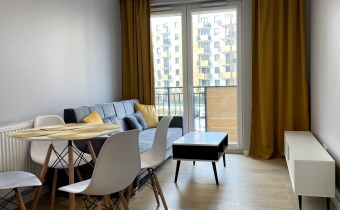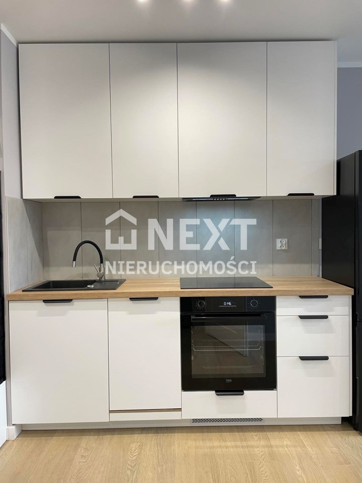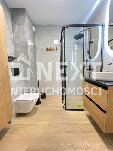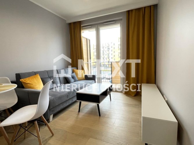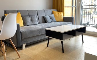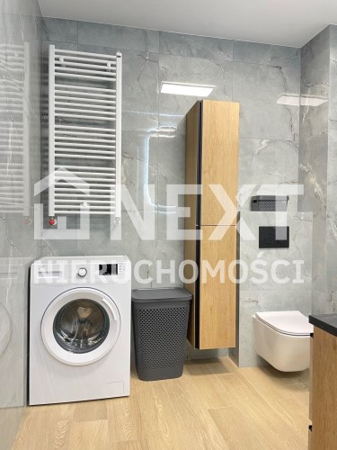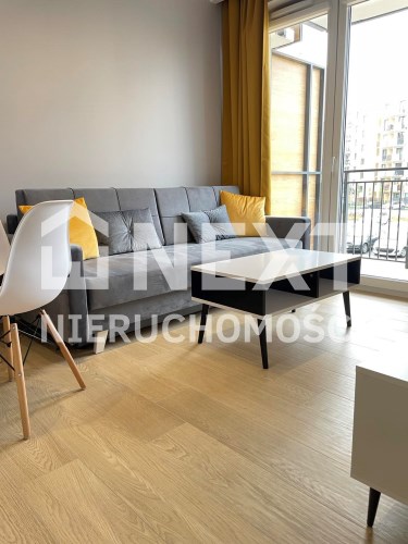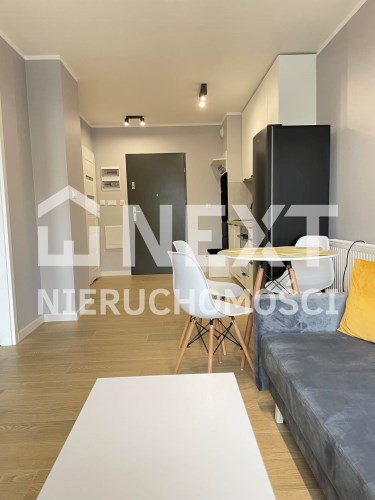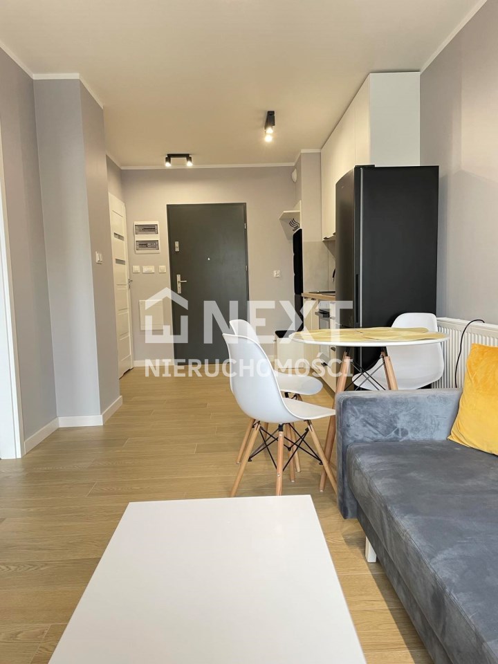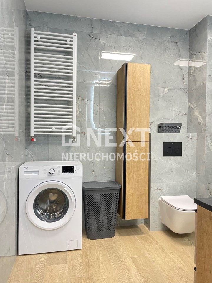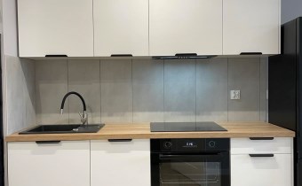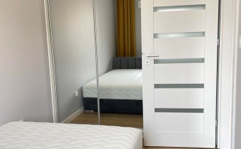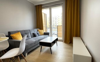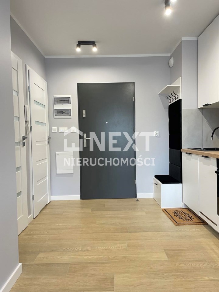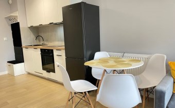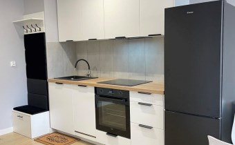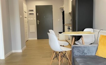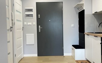 Mieszkanie jest kompletnie oraz gustownie wyposażone. Nieruchomość składa się z komfortowej łazienki z wygodną kabiną prysznicową, toaletą, umywalką oraz pralką. Salon jest połączony z aneksem kuchennym, z którego można wyjść na balkon. Dodatkowo w mieszkaniu został wydzielony schowek z licznym półkami oraz wieszakami. Aneks kuchenny jest wyposażony w piekarnik, płytę indukcyjną, zmywarkę. Sofa w salonie posiada funkcję spania. Sypialnia wyposażona w łóżko oraz bardzo dużą szafę.
