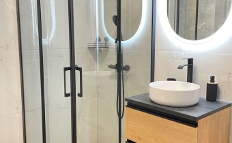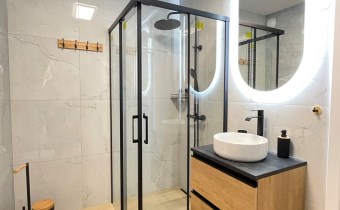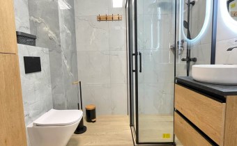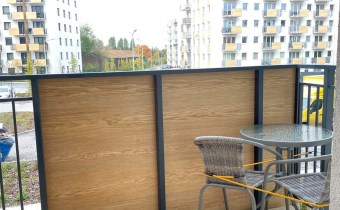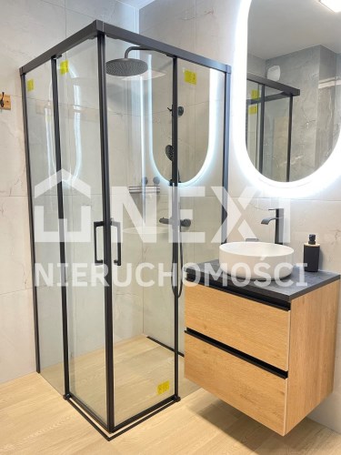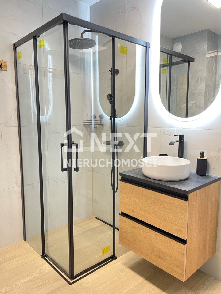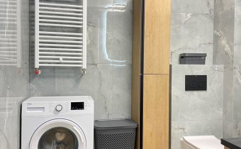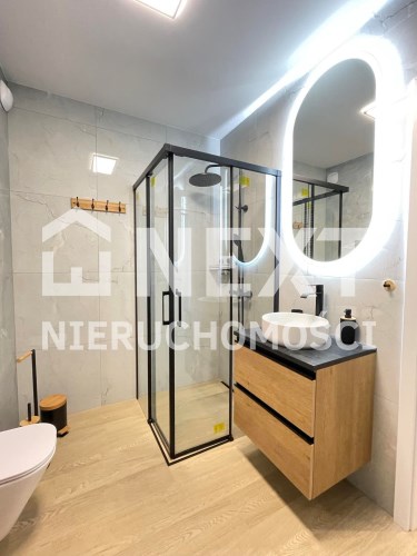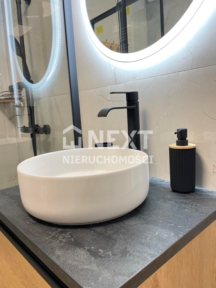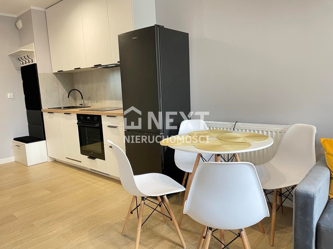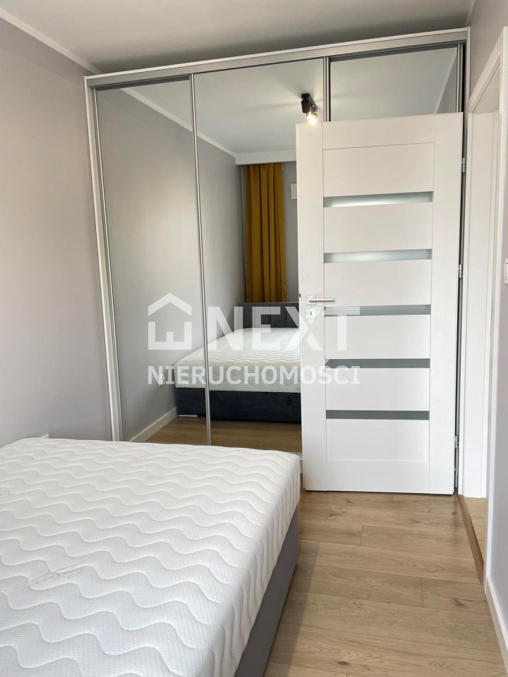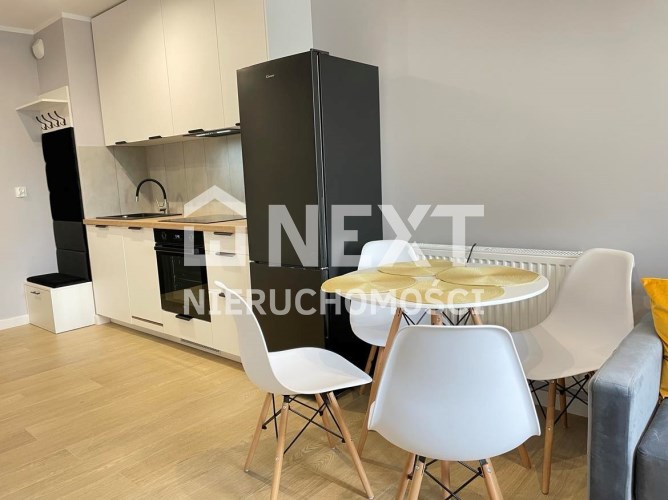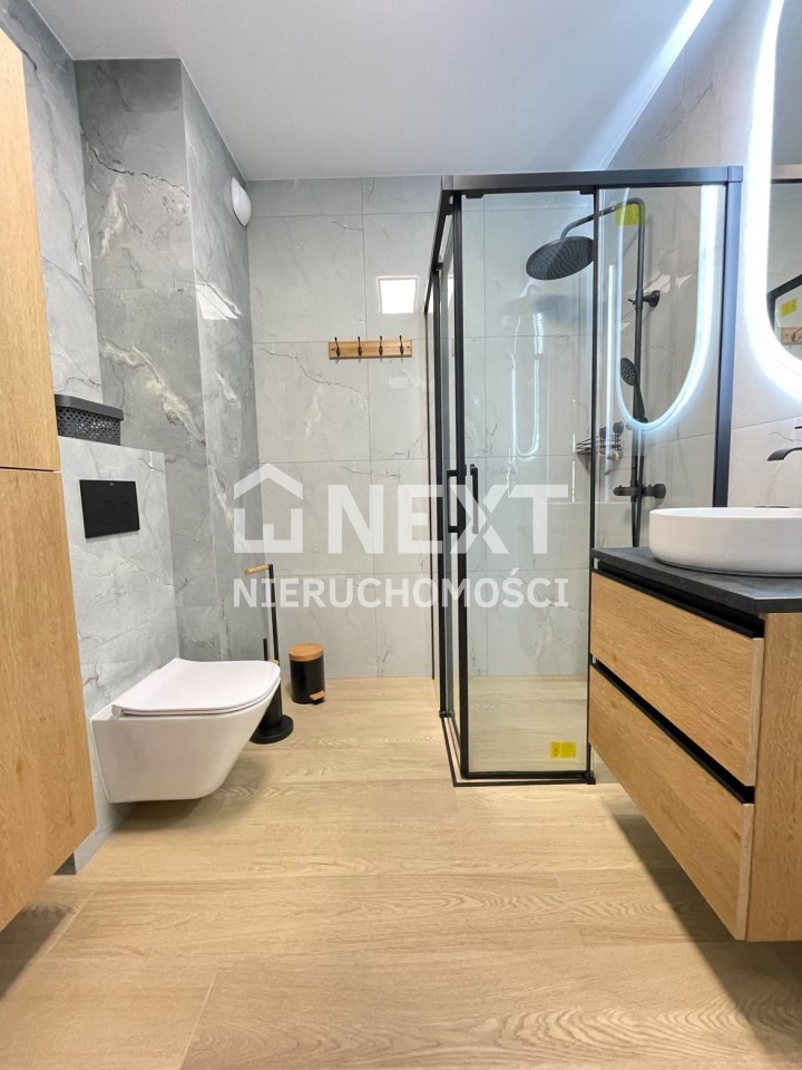 Mieszkanie jest kompletnie oraz gustownie wyposażone. Nieruchomość składa się z komfortowej łazienki z wygodną kabiną prysznicową, toaletą, umywalką oraz pralką. Salon jest połączony z aneksem kuchennym, z którego można wyjść na balkon. Dodatkowo w mieszkaniu został wydzielony schowek z licznym półkami oraz wieszakami. Aneks kuchenny jest wyposażony w piekarnik, płytę indukcyjną, zmywarkę. Sofa w salonie posiada funkcję spania. Sypialnia wyposażona w łóżko oraz bardzo dużą szafę.
